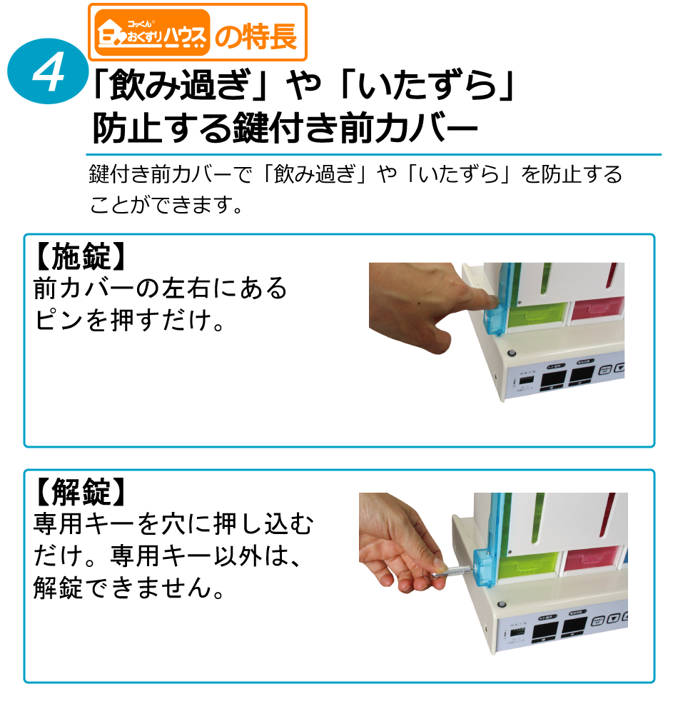 4.「いたずら」「飲み過ぎ」防止するロック機能つき前カバー
